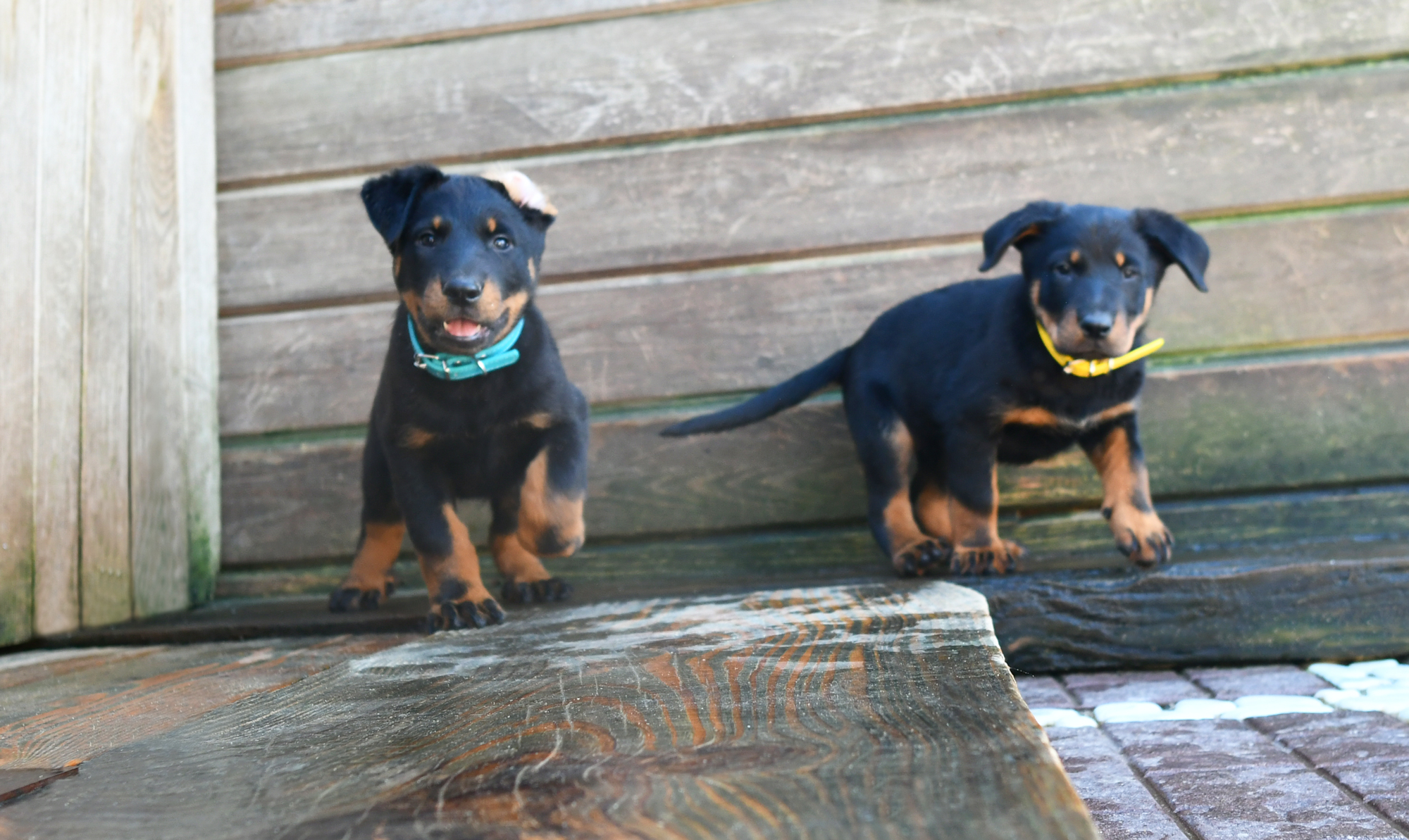 maschio nero focato collare celeste, e femmina nero focata collare giallo (cucciolata DIANA x SIRIUS)