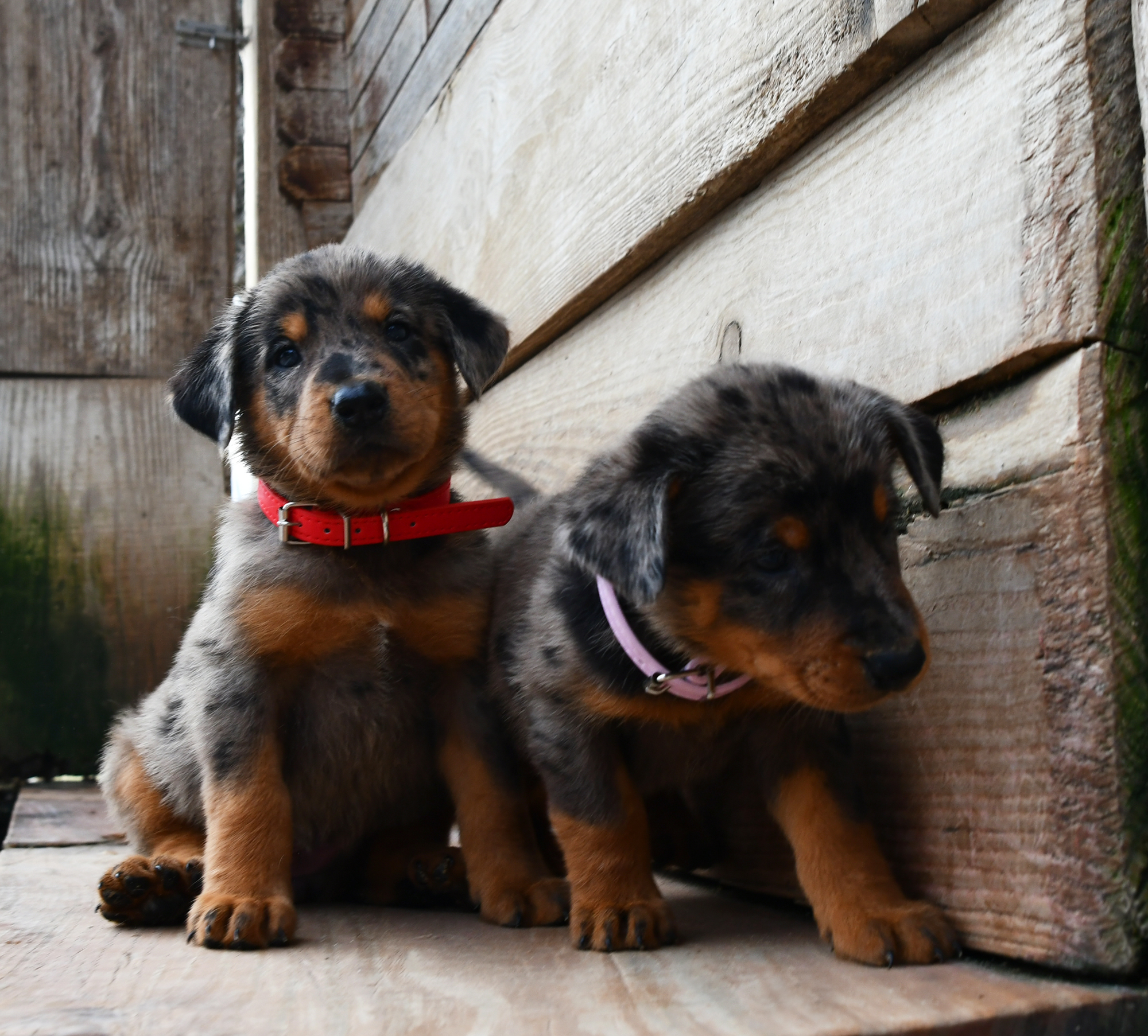 le due femmine arlecchino : collari rosso e rosa